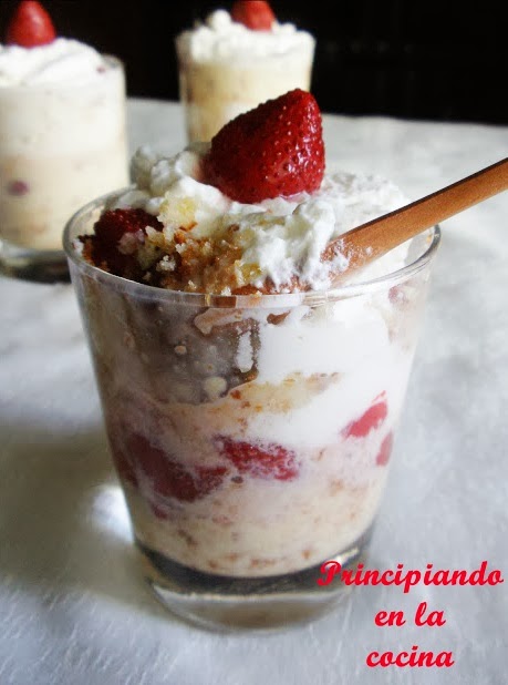 3.       En el recipiente o recipientes escogidos desmigamos un poco de bizcocho en la base. Añadimos una capa de crema inglesa, una de fresas y una de nata. Repetimos el proceso hasta coronar con nata y una fresa a modo de decoración.